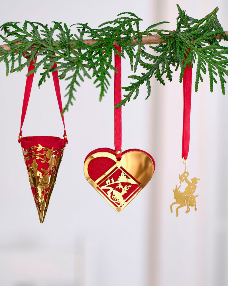 Disse tre miniature ophæng bringer eventyret Klods-Hans helt ind i dit hjem og dit hjerte. De små, men detaljerede motiver består af den trodsige Klods Hans, et klassisk kræmmerhus og et flettet julehjerte – alle udført i messing og forgyldt med 18 karat guld.