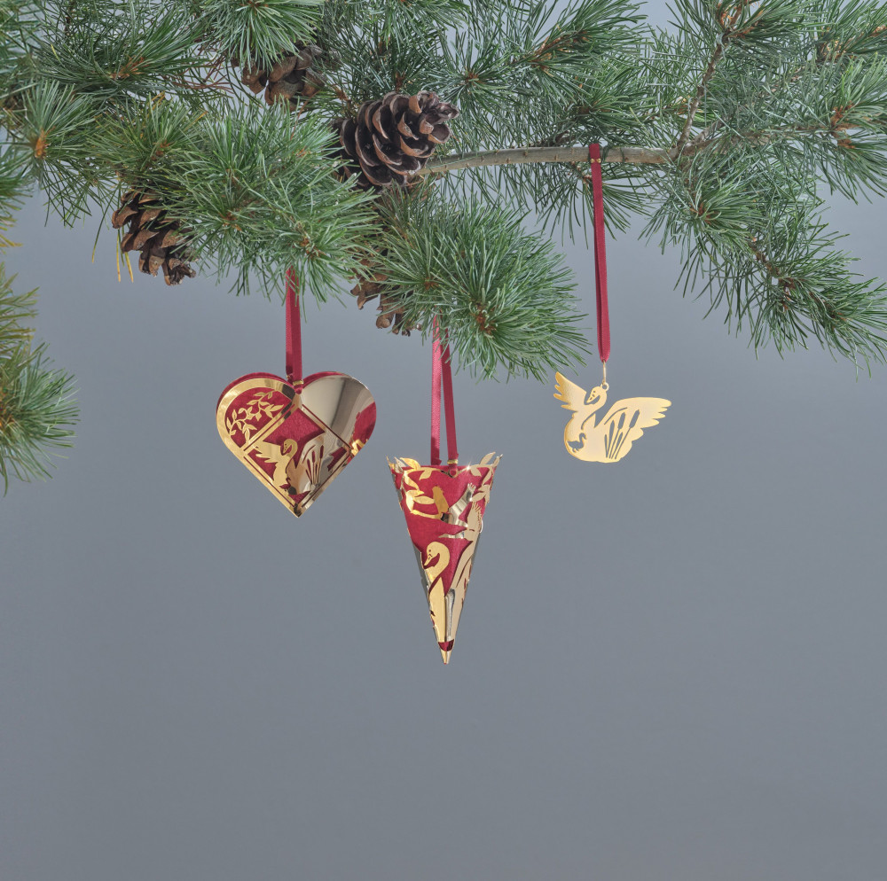 Pynt dit juletræ med denne smukke og elegante julepynt fra Hans Christian Andersen by Nordahl Andersen. Sættet indeholder 3 forgyldte miniature-ophæng med inspiration fra eventyret 'Den grimme ælling', alle belagt med 18 kt guld.