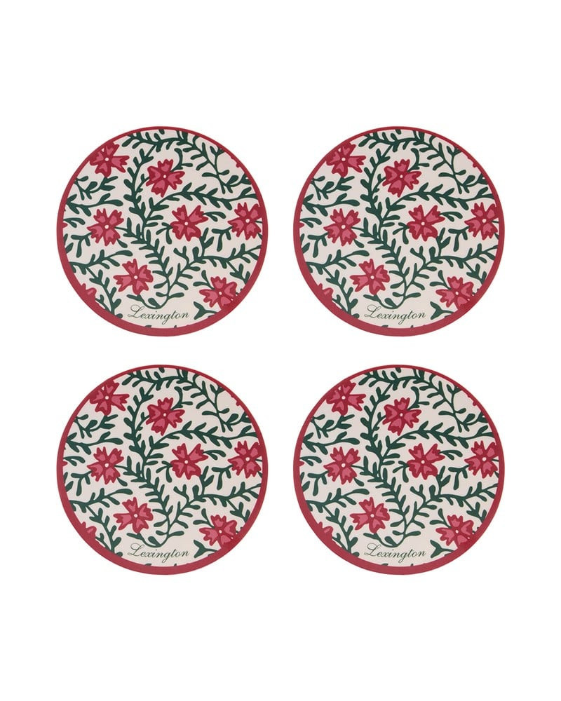 Sæt med 4 elegante glasunderlag på birke finér med smukt højtidsblomsterprint. FSC-certificerede, opvaskemaskine-sikre og perfekte til at beskytte bordet med stil. Kommer i flot gaveboks og matcher dug og servietter fra samme kollektion.