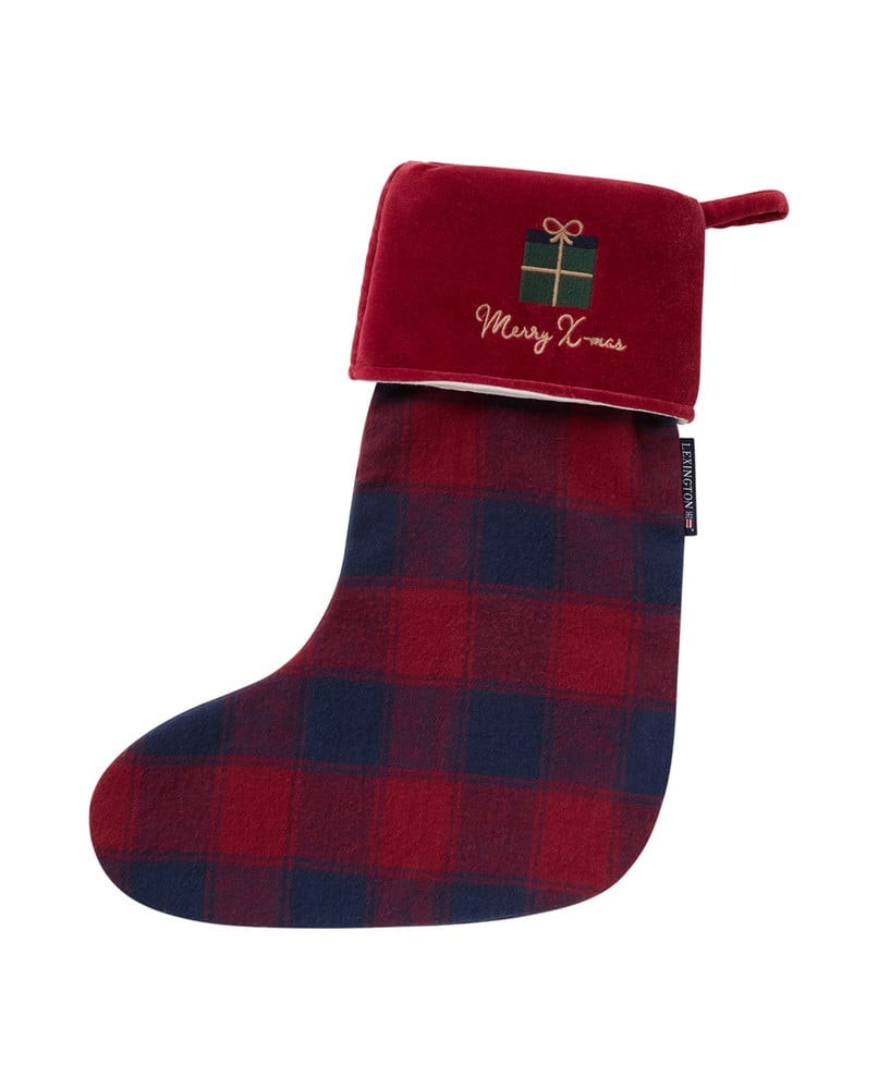 Skab klassisk julestemning med denne økologiske bomuldsjulestrømpe i mørkeblå og rød tern. Fremstillet af blød bomuldsflannel med luksuriøs velour-top broderet med “Merry X-Mas”. Fyldt med genanvendt polyester og produceret i en certificeret Green Factory – et bæredygtigt valg med tidløs Lexington-charme.